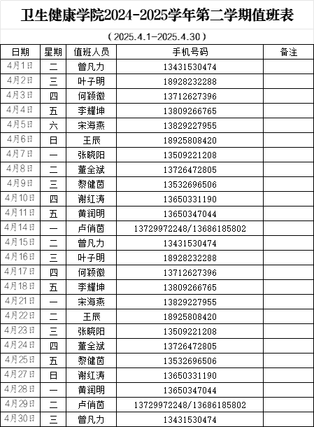 太阳成集团tyc234cc2024-2025学年第二学期值班表(4月)