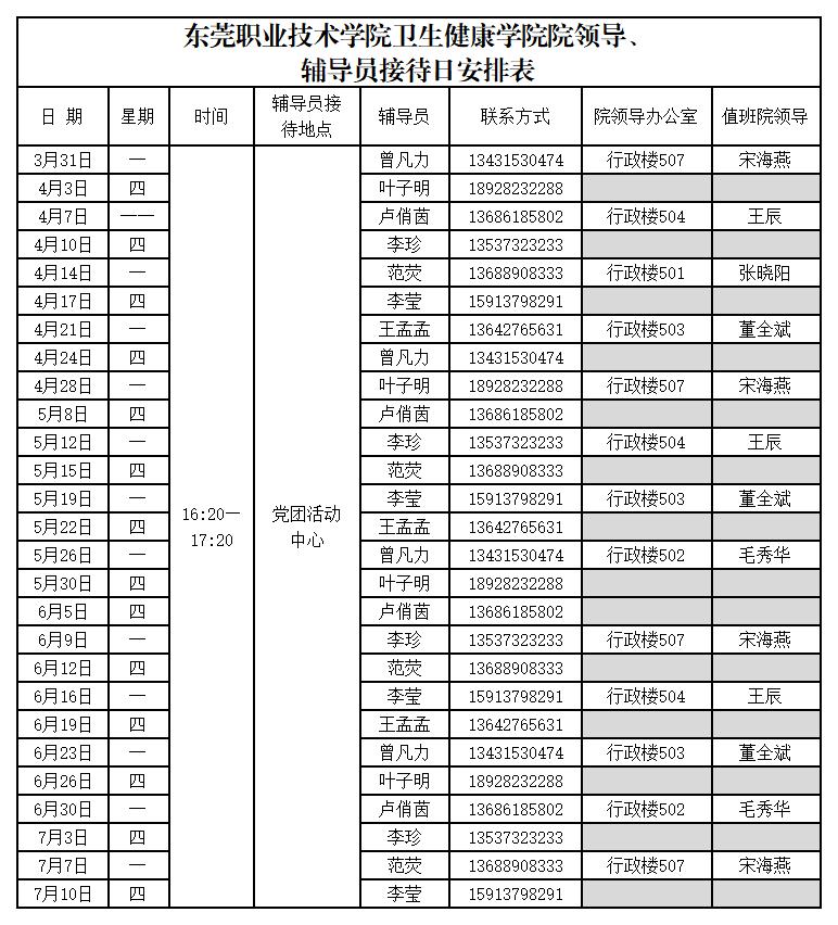 为面对面倾听师生诉求,实际解决师生关心关注的身边难题,公司本学期院领导、辅导员接待日具体安排如下: