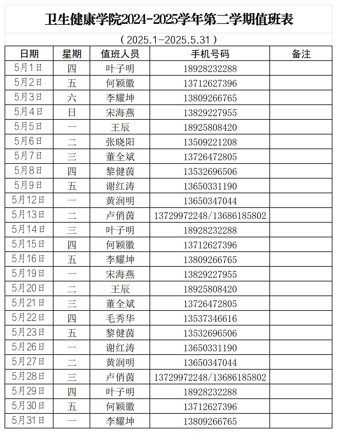 太阳成集团tyc234cc2024-2025学年第二学期值班表(5月)