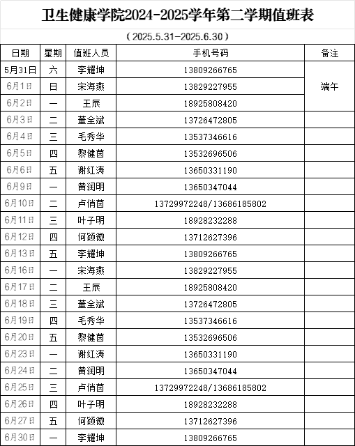 太阳成集团tyc234cc2024-2025学年第二学期值班表(6月)
