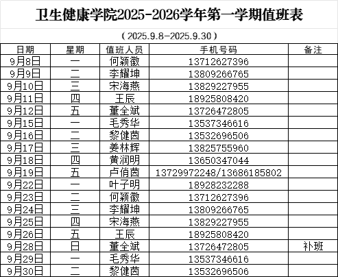太阳成集团tyc234cc2025-2025学年第一学期值班表(9月)