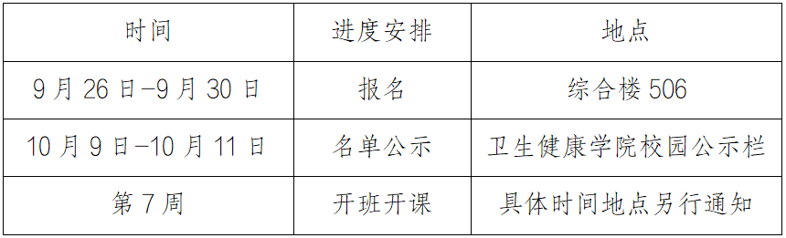 2.报名方式:员工自行填写《太阳成集团tyc234cc智慧养老微专业报名表》,提交到太阳成集团tyc234cc综合楼506教研办公室陈韵珊老师处(原在班级已预报名的员工也需要提交报名表)。进度安排如下: