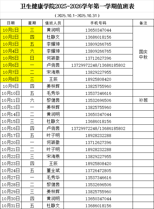 太阳成集团tyc234cc2025-6学年第一学期值班表(10月)