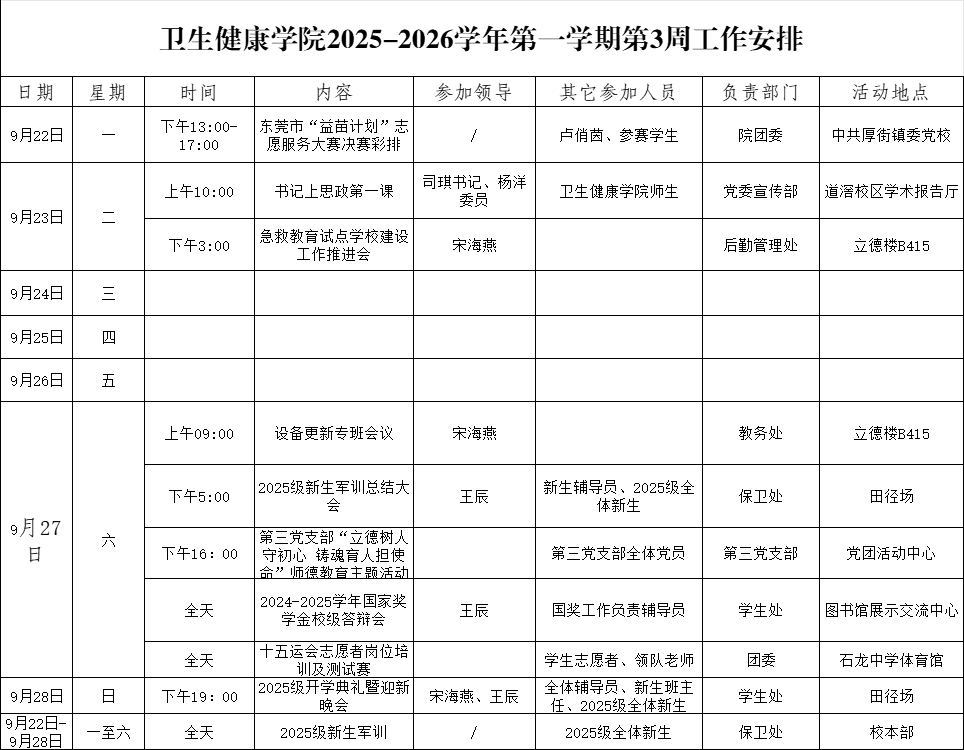 太阳成集团tyc234cc2025-2026学年第一学期第3周工作安排