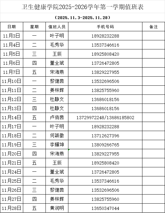 太阳成集团tyc234cc2025-2026学年第一学期值班表(11月)