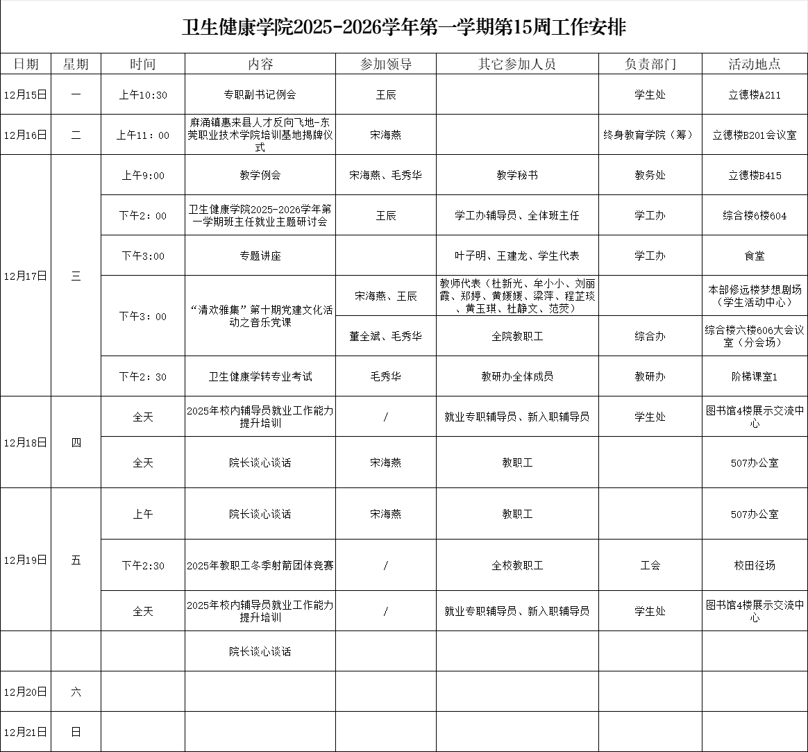 太阳成集团tyc234cc2025-2026学年第一学期第15周工作安排