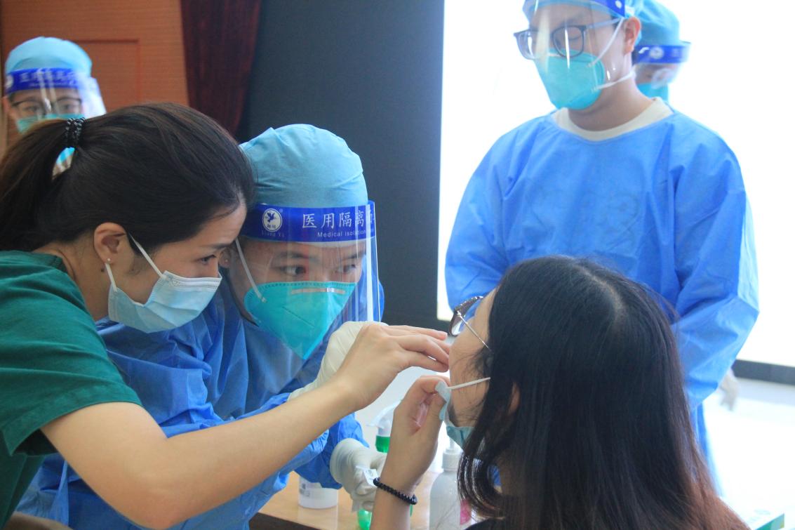 医护人员认真详尽地讲解并演示核酸采集技术、隔离服穿脱的过程。讲解结束后,医护人员现场指导同学实际操作各项流程。