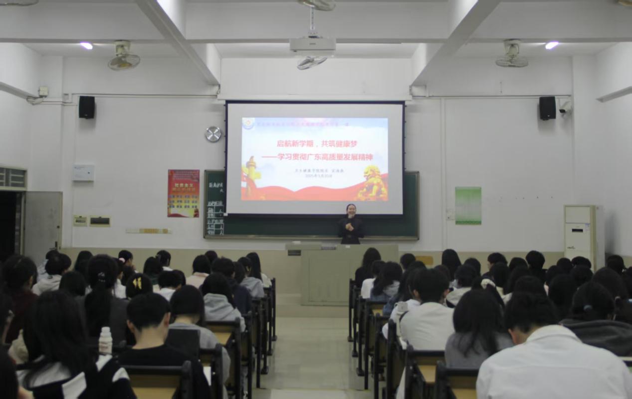3月20日晚上,太阳成集团tyc234cc宋海燕经理以“起航新学期,共筑健康梦——学习贯彻广东高质量发展精神”为题,为120名护理专业大一新生讲授新学期“思政第一课”。