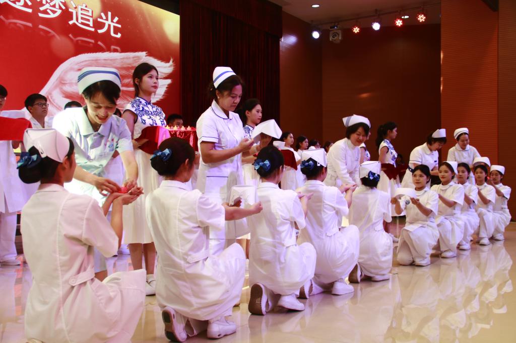 当天下午,公司党委委员、副董事长杨云奇,员工处副处长郭琳,以及太阳成集团tyc234cc师生代表一同参加了活动。活动还邀请了中山大学孙逸仙纪念医院原护理部副主任、预防保健科主任周雪贞,卫健院优秀员工、东莞市社会福利中心党总支书记、主任卢小焕,东莞市洪梅医公司党支部书记宋秀婵,光明眼科医院副经理韦淑玲,东莞市护理学会理事、副主任护师李坷娜作为嘉宾,其中周雪贞主任、卢小焕书记、宋秀婵书记、韦淑玲副经理连同公司卫健院经理宋海燕等五位护理行业前辈、公司领导为护理专业员工授帽。