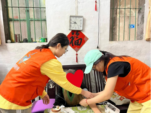 队员们深入老人家中,不仅给老人们送上承载关怀的“微心愿”物资,更依托专业所长,提供血压测量、血糖检测、艾灸理疗、推拿按摩、耳穴贴压等多项健康服务,将温暖与健康实实在在送进家门,融入日常。