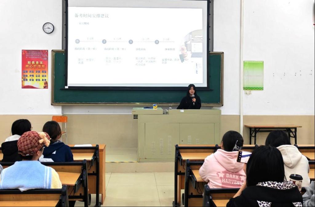 赵浩钧同学则从实习选择、插本院校、插本考试分析等三个板块出发,分享了自己的药学职业发展经历。他提醒师弟师妹们,一定要提前查看报考院校的考试范围,避免复习方向出错,同时要注重回归课本、认真上课、抓好基础。他也分享了组建学习小组的经验,分析了学习小组从资源高效共享到互相监督,再到模拟提问场景运用等多方面的优势。