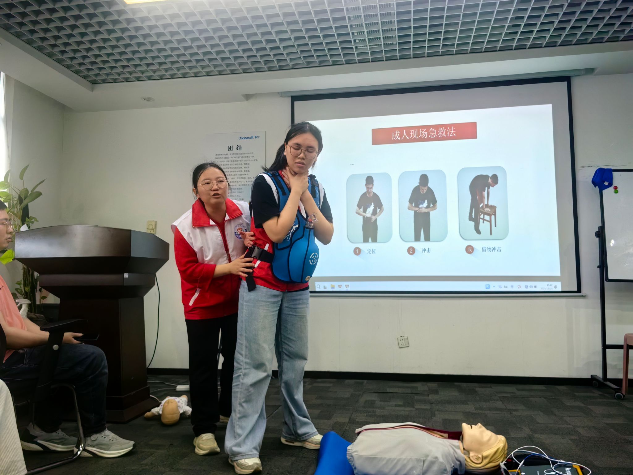 实践环节中,参训员工分组进行心肺复苏、AED模拟与海姆立克手法练习。教师与员工助教全程跟进,及时纠正动作细节,细致答疑。学员积极参与,交流踊跃,现场气氛热烈而专注。