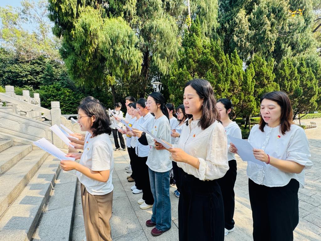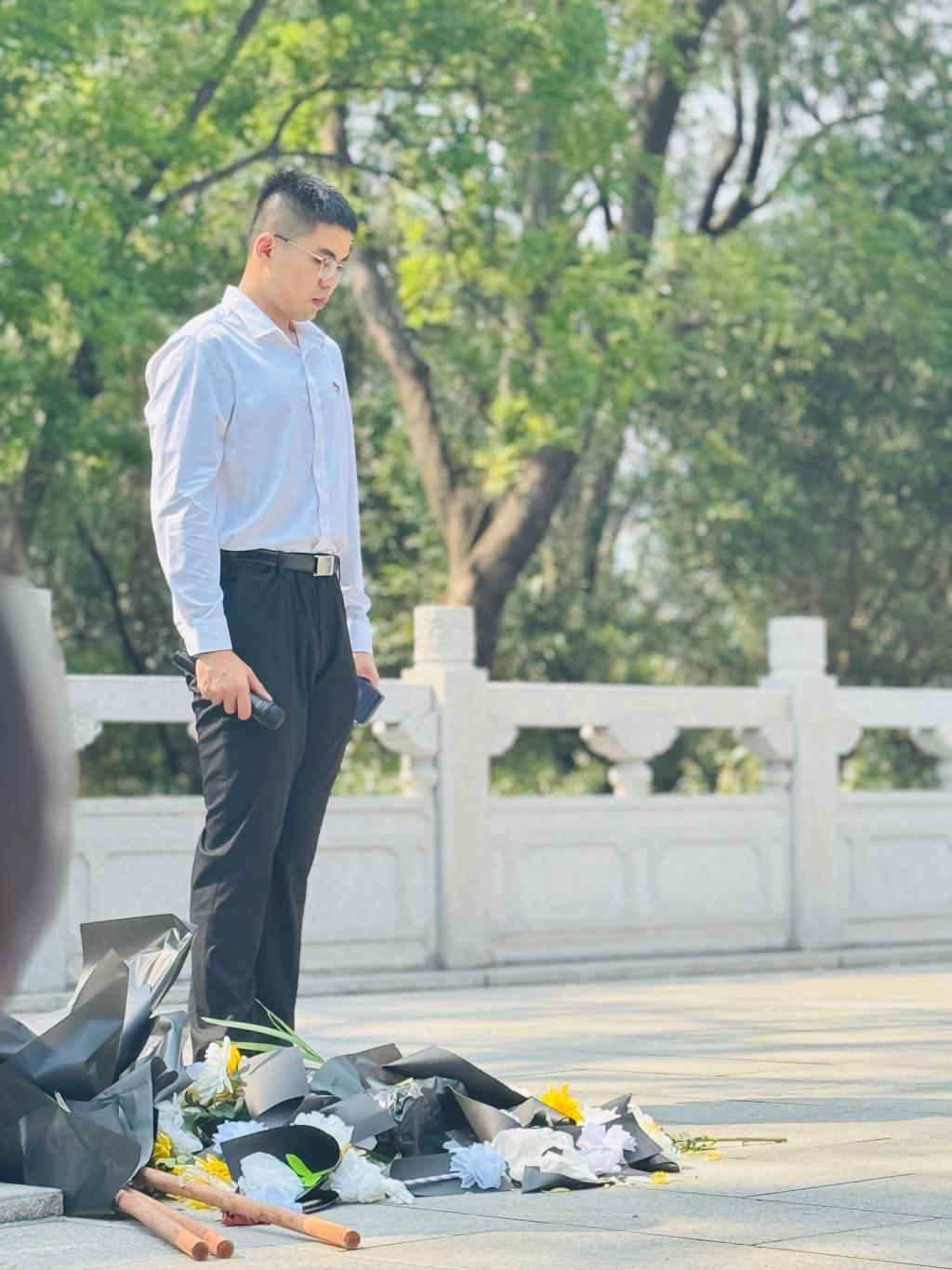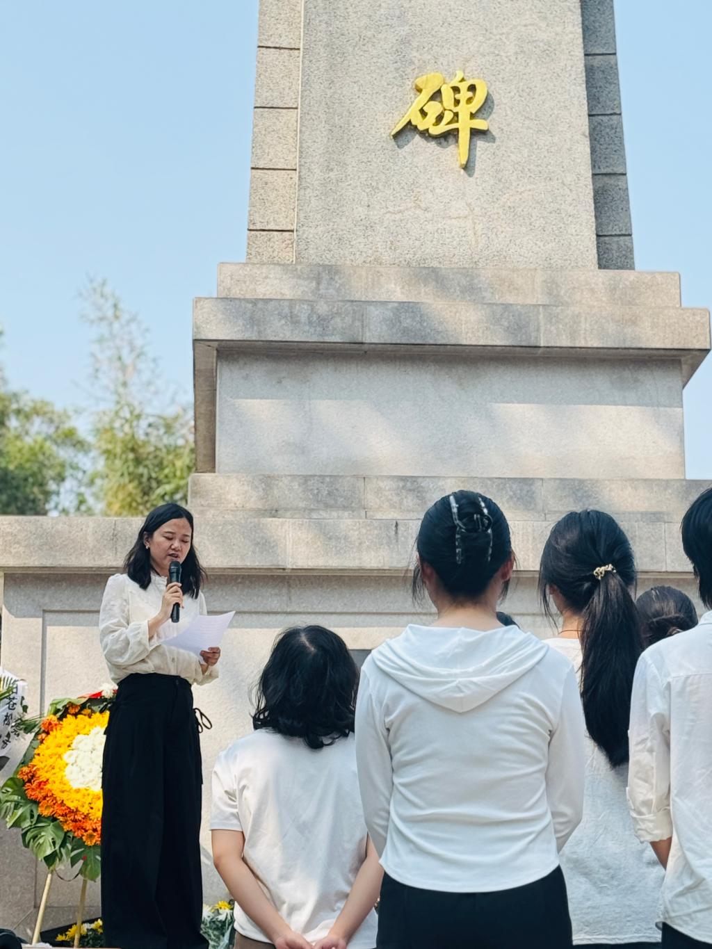 全体默哀三分钟后,参与人员依次向烈士敬献鲜花,并集体朗诵诗句,深切缅怀革命先烈。随后,师生代表分享活动感悟。教师党员代表卢俏茵同志结合先烈事迹,呼吁大家珍惜和平,共创美好未来。员工党员代表周冰盈同志表示,要将先烈们的革命精神融入到日常的学习和生活中,以实际行动为祖国的繁荣富强贡献自己的力量。活动最后,全体党员一同重温入党誓词。